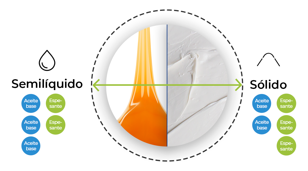 La proporción entre estos dos elementos genera una solidez determinada, si en esta relación aumenta el espesante, la grasa tendrá una consistencia mayor y viceversa.