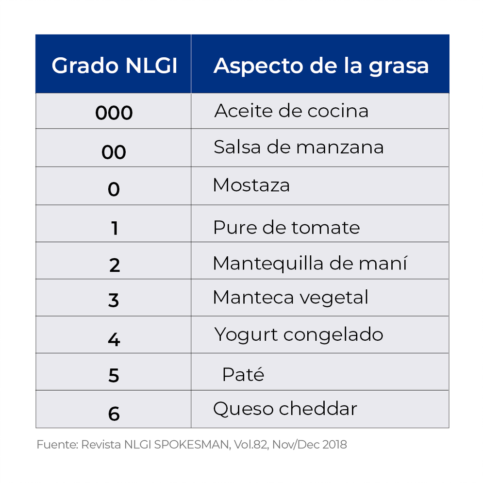En la siguiente tabla te mostramos elementos cotidianos con los que se puede comparar la consistencia de una grasa de acuerdo al grado NLGI.
